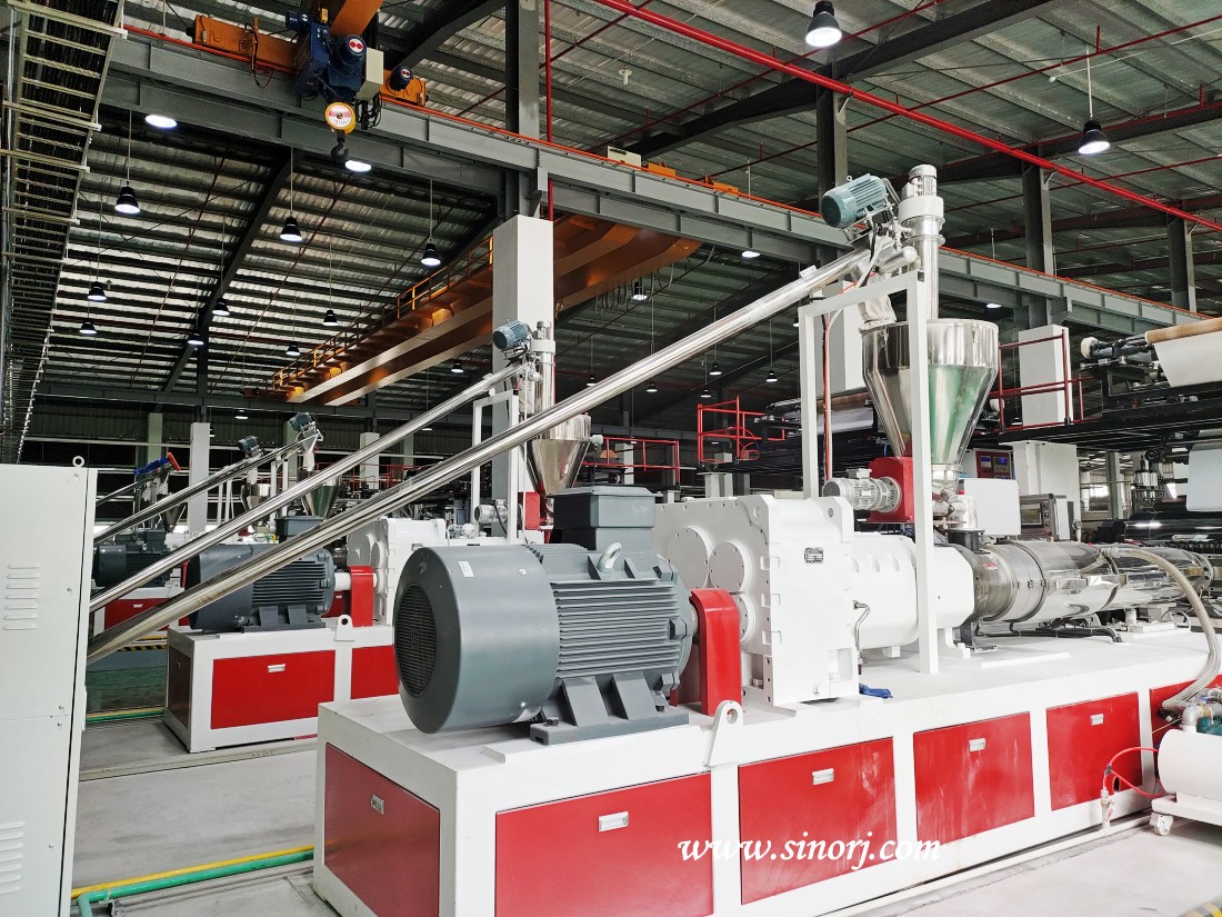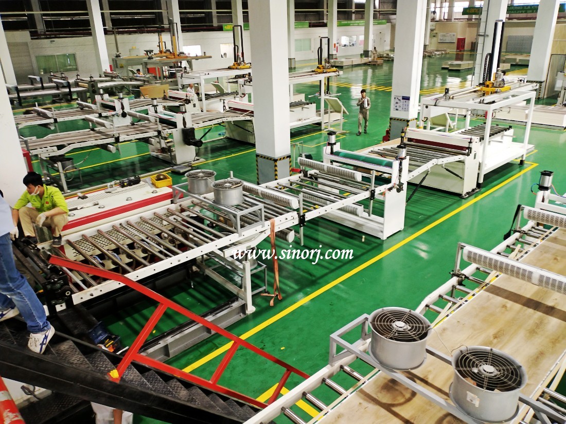 擠出基材后熱敷彩膜裝飾層和耐磨層,以及底部的軟墊隔音層,實(shí)現多層復合一步法在同一臺設備上完成。