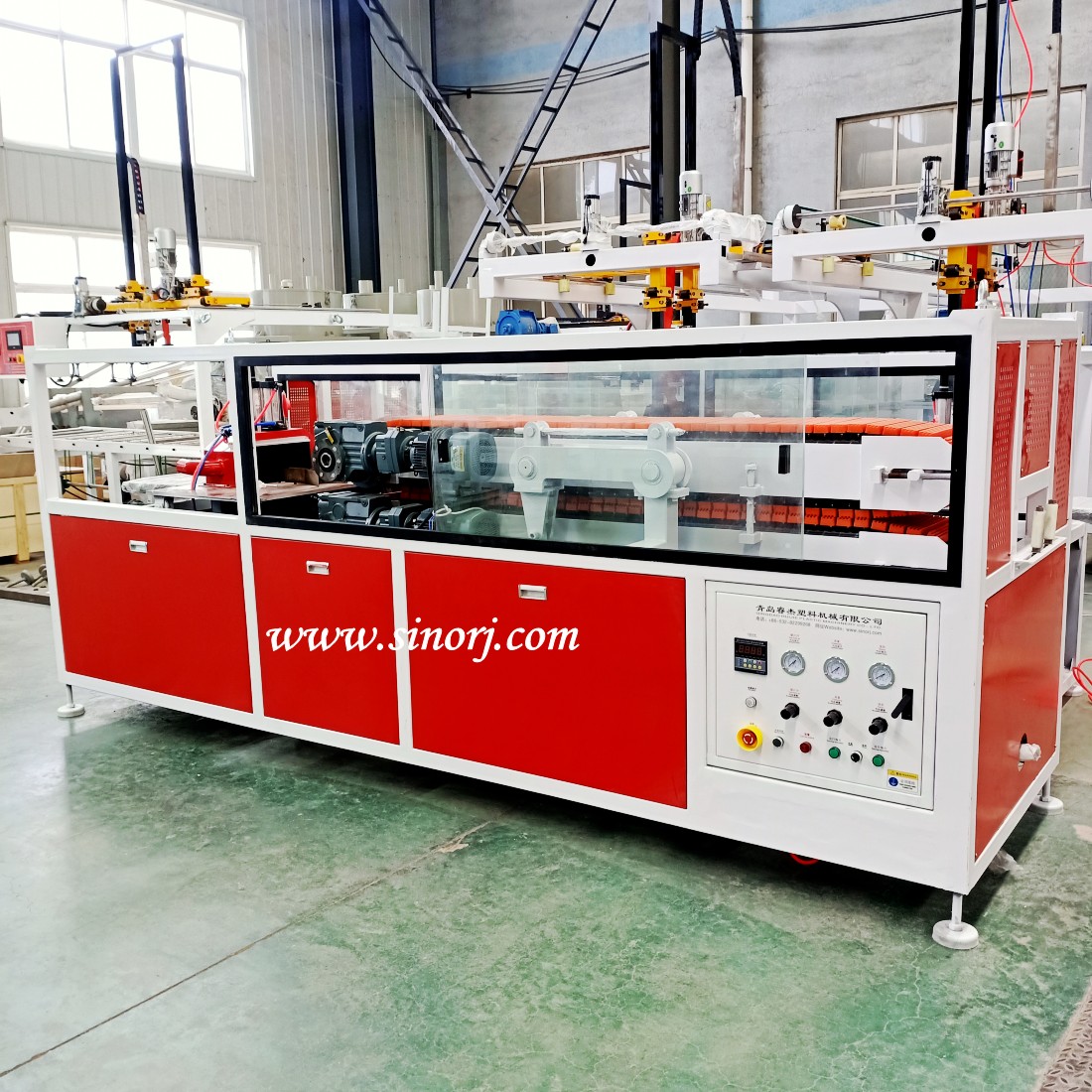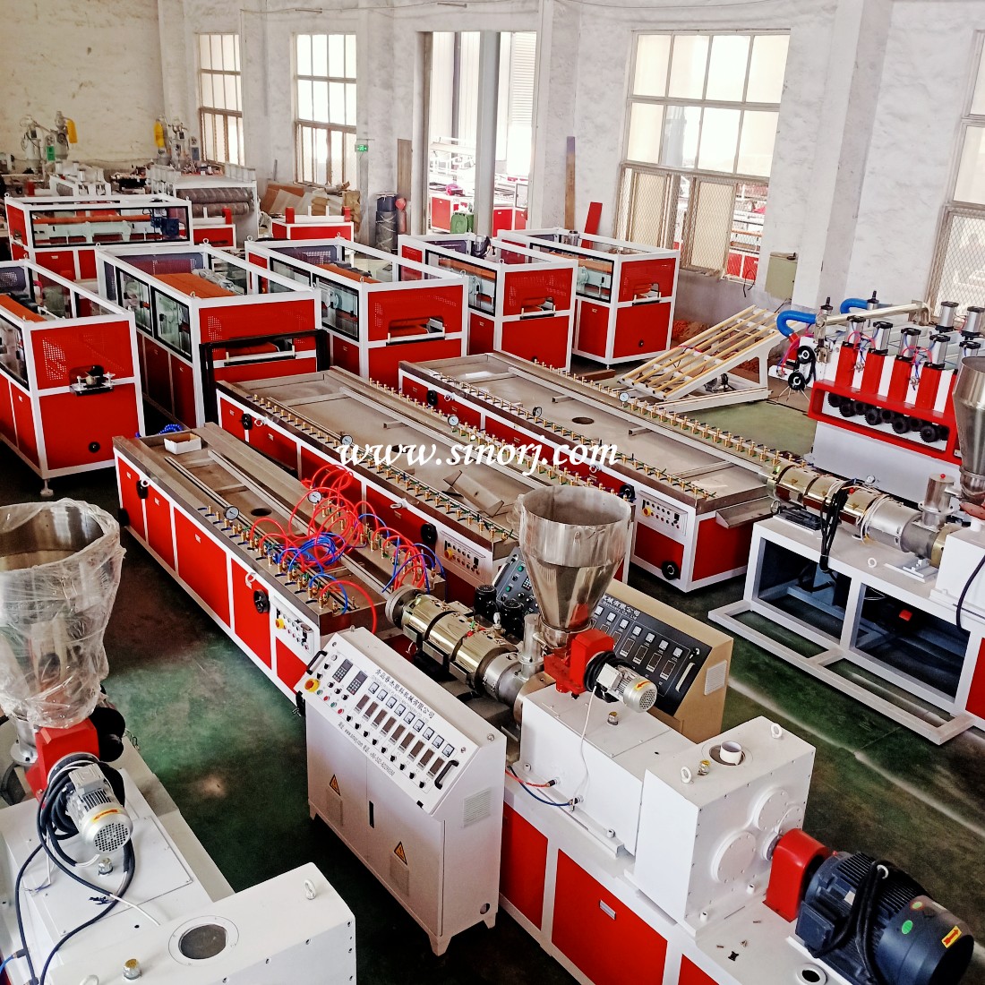 由錐型雙螺桿,模具、真空型臺、牽引機、切割機、翻料架組成。生產(chǎn)線(xiàn)采用自動(dòng)化控制,自動(dòng)化程度高,設備穩定,操作簡(jiǎn)便,生產(chǎn)效率高。通過(guò)更換不同規格的模具可以生產(chǎn)多種規格、尺寸、形狀、厚度的石塑裝飾墻板。